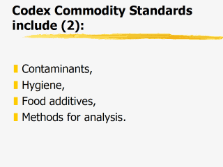 | The standards related to the basic composition and the quality factors ensure that no substandard quality may be purchased, while the standards of food additives and contaminants as well as the hygiene standards protect the health of the consumers. |