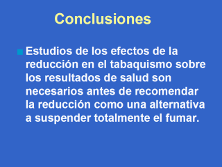 | Nuestros hallazgos sugieren que reducir la exposición al tabaco sin quitarlo puede no mejorar el peso al nacer, a menos que bajos niveles de exposición sean logrados. Estudios adicionales de redución en el tabaquismo durante el embarazo son necesarios antes de que podamos recomendar reducción como una alternativa a la suspensión de las embarazadas fumadoras. |