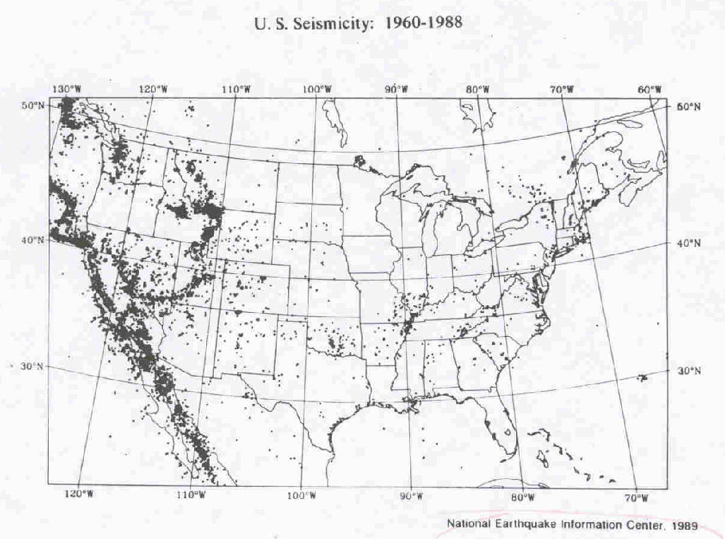 United States seismic activity. This U.S. Geological Survey map depicts earthquake risk in the continental United States. The dots represent active seismic areas from 1960 to 1988. National Earthquake Information Center, 1989.
