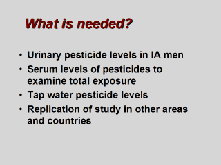 Next, we plan to examine urinary pesticide levels in Iowa men. We also hope to obtain funds to test home tap water for pesticides, so we can correlate these levels with those in men’s urine samples. We are in the process of examining serum hormones in relation pesticide exposure in Missouri and Iowa. We would like to look at exposure of the women and children in these families, for whom we have urine stored. Finally, this study should be replicated in other areas of the United States as well as in other countries. |