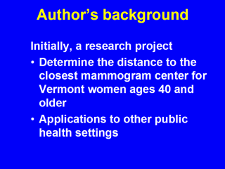 | During my research fellowship, I was asked to use geographic information systems (GIS) to determine which areas within my state had unusually long driving distances to obtain breast cancer services. I have used this technique in a grant for the National Cancer Institute. In addition to access to breast cancer care, this methodology can address questions of access to medical care and planning the placement of new medical facilities. |