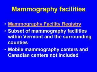 | The Food and Drug Administration maintains a list of United States mammography facilities who have met or exceeded the requirements outlined in the Mammography Quality Standards Act of 1992. Centers not meeting these standards are not eligible to receive reimbursements from Medicaid or Medicare. We limited our study to mammography centers in and around Vermont. Mobile mammography centers and Canadian centers were not included. |