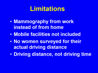 | This project has several limitations. First, women may travel from work instead of home to get a mammogram, altering the projected distance traveled. Second, women may obtain mammography from a mobile mammography facility. Third, the study was not validated against women’s actual driving distance. Finally, driving time may be a better measure of access than driving distance. Unfortunately, driving time was not explicitly modeled in this analysis. |