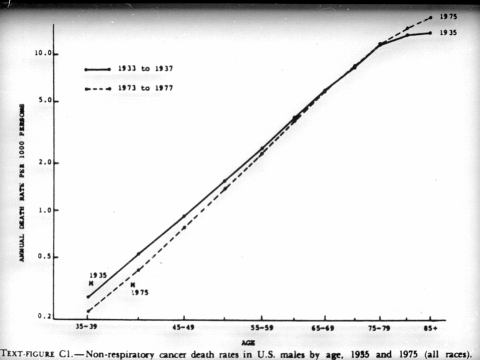 TAXAS DE MORTALIDADE DE HOMENS, POR CÂNCER NÃO PULMONAR, POR IDADE, nos EUA,
