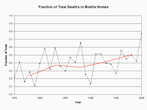 We can compare the Oklahoma City tornado with other tornadoes to see whether this increased risk holds true and to see what kind of changes have been occurring. Since 1975, the National Weather Service has separated out tornado fatalities associated with mobile homes. Data for other fatality locations (permanent* homes, other buildings, vehicles, outdoors) are available online from the Storm Prediction Center (http://www.spc.noaa.gov/climo/), starting with 1985. The fraction of deaths occurring in mobile homes has been increasing since 1975. Using a Kendall’s tau test (Press et al. 1992), the increase is statistically significant at the 95% confidence level. From 1976 to 1980, 24% of tornado deaths were in mobile homes. That fraction increased to 34% in 1986–90 and to 50% from 1996 to 2000. * Definitions are not universally accepted. ‘‘Permanent’’ homes are often referred to as ‘‘site built’’ and ‘‘mobile homes’’ are often referred to as ‘‘manufactured housing.’’ |