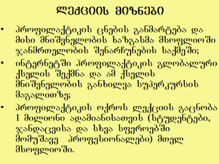 medicinisa da sazogadoebrivi jandacvis yvela leqtorsa da instruqtors vTxovT waikiTxos es leqcia da gaavrcelos igi. "codnis Zala mis gaziarebaSia". Cven gvsurs am leqciiT mivwvdeT planetis 1 milion mosaxles. Tqven SegiZliaT es leqcia gaugzavnoT imden adamians, ramdensac moisurvebT da amasTanve gTxovT gvacnoboT am adamianebis vinaoba. Tu Tqven gaqvT raime idea am leqciis gavrcelebis axali arxebis Sesaxeb, gTxovT, acnoboT superkursis jgufs (super2@pitt.edu).superkursis wevrobis msurvelebs SeuZliaT mimarTon www.pitt.edu/~super1 or e-mail super2@pitt.edu globaluri profilaqtikuri qselis wevroba Tqven mogcemT saSualebas ufasod miiRoT kompaqt-diski leqciebis Casatareblad. |