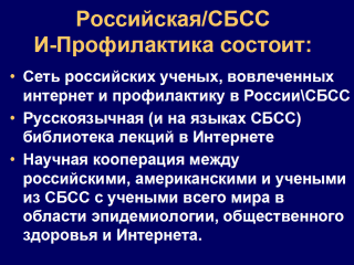 | И-профилактика использует инструмент интернета для сбора информации от огромного числа людей (и здоровых, и больных) с целью профилактики заболеваний и инвалидности. Информация всегда улучшала здоровье. Интернет предоставляет недорогой способ передачи информации от человека к человеку, внутри и между странами для профилактики заболеваний. |