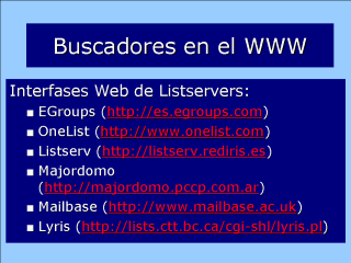 Busca listas de discusión en los LISTSERVERS de Egroups, un servicio gratuito/pagado de listas de discusión. Cualquier lista en Egroups puede bloquear su aparición en el catálogo si lo desea el ADMINISTRADOR o MODERADOR. Las listas cuyo LISTSERVER no funciona en EGroups no son buscadas por este servicio. Las listas médicas mas serias y académicas funcionan habitualmente en LISTSERVERS de instituciones académicas/gubernamentales. OneList Ya no existe como tal, pues fue adquirida por EGroups. Refiérase a EGroups en el futuro. Listserv Los LISTSERVERS que funcionan con Listserv (R) pueden ofrecer una página web para buscar sus listas de discusión localmente en lugar de hacerlo a través de CataList. Un ejemplo es el LISTSERVER de RedIris en España. Generalmente CataList permite ubicar la misma información si el LISTSERVER no ha bloqueado su aparición en el buscador. Majordomo Es un programa gratuito para LISTSERVERS con sistemas operativos Linux y Unix. Algunos de estos LISTSERVERS con Majordomo ofrecen una página web para buscar sus listas de discusión localmente. Lamentablemente no hay un buscador que al igual que CataList, agrupe los LISTSERVERS que funcionan con Majordomo. Un ejemplo de interfase web para Majordomo: www.majordomo.com. Mailbase Es un LISTSERVER británico, que contiene más de 2000 listas de diferentes temas académicos. Ofrece una interfase web que permite buscar listas, suscribirse/desuscribirse, revisar archivos de mensajes antigüos, etc. Lyris Este programa para LISTSERVERS tiene la capacidad de interfase web para que un LISTSERVER permita buscar sus listas de discusión. Un ejemplo es: The Centre for Curriculum Transfer & Technology en Canadá. Recuerde que Tile.Net es un buscador que incluye LISTSERVERS que funcionan con Lyris.