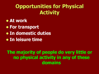 Opportunities for people to be physically active exist in four major domains of one’s day-to-day life: