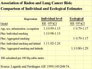 | The individual level analysis shows an association between the risk of lung cancer and levels of radon, whereas the ecological analysis does not show an association. |