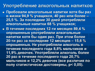 течение жизни хотя бы один раз. Из них 11 % напивались 20 раз или более.