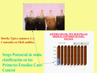 Solo las botellas del tipo de la etiquetada en el gráfico con el número 1, a la izquierda, tiene la suficiente proporción de contaminación química indicadora del aceite responsable de la epidemia. El resto de las botellas cumplían los criterios de definición de caso de los primeros estudios caso-control pero no producían enfermedad (problemas de mala clasificación en los primeros estudios caso-control) Posada de la Paz M, Philen RM, Abaitua Borda I, et al. Toxic oil syndrome: traceback of the toxic oil and evidence for a point source epidemic. Food Chem Toxicol 1996;34(3):251-7. |