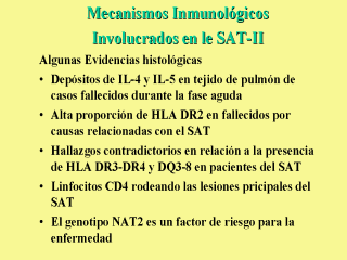 Por otro lado la presencia de un determinado gen que codifica encimas que con una alta probabilidad están involucradas en el metabolismo de las sustancias químicas descritas refuerzan la idea de la susceptibilidad individual y la diferente respuesta observada en los pacientes del Pozo V, de Andres B, Gallardo S, et al. Cytokine mRNA expression in lung tissue from toxic oil syndrome patients: a TH2 immunological mechanism. Toxicology 1997;118(1):61-70. Cardaba B, Gallardo S, Del Pozo V, Ezendam J, Izquierdo M, Martín C, Cortegano I, Aceituno E, Rojo M, Arriete I, Palomono P, Posada de la Paz M, Lahoz C. DR2 antigens are associated with severity of disease in Toxic Oil Syndrome (TOS). 2000. Tissue Antigens, 2000. 55(2): 110-117. |