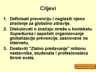 Podstaknimo sve predavače javnog zdravlja i medicine da pročitaju i koriste ovo predavanje u svojoj nasatvi. "Znanje se razmenjuje" Želimo da pošaljemo ovo predavanje jednom milionu ljudi širom sveta. Slobodno pošaljite ovo predavanje što je moguće većem broju ljudi i molimo Vas da nas obavestite kome ste ga sve poslali. Ako imate bilo kakvih nedoumica o načinu distribuiranja ovog predavanja, podelite ih s grupom Superkursa (super2@pitt.edu). Da biste se pridružili Superkursu, posetite www.pitt.edu/~super1 ili pošaljite e-mail na adresu super2@pitt.edu. Članstvo u Globalnoj zdravstvenoj mreži Superkursa obezbeđuje Vam pravo da dobijete besplatno Superkurs CD-e predavanja koja se upravo drže, kao i godišnja predavanja o prevenciji. Napomena: "send this lecture to a friend" ("pošalji ovo predavanje prijatelju") radi u Power Point slajd šou. |