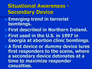 | Secondary explosive devices have been used by terrorists to deliberately target first responders. The initial detonation (primary device) serves as an attention and crowd gathering tool. The secondary device detonates in a delayed manner, and is designed to impact the responders. The secondary device may actually have more explosive potential than the primary device. |