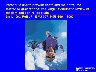 parachutes has been applied to many interventions in medicine. OBSERVATIONAL DATA ARE INFERIOR TO RCT DATA: Hormone replacement therapy (HRT) use appeared to lower coronary heart disease (CHD) risk in observational studies; The Women's Health Initiative (an RCT) showed that HRT raises CHD (and many other) risks. NATURAL HISTORY OF GRAVITATIONAL CHALLENGE: If failure to use a parachute resulted in 100% mortality, that might be evidence of effectiveness. However, survival from falls of 33,000 feet have been documented. Furthermore, parachutes have been associated with morbidity and mortality. Therefore RCTs are needed to determine the balance of risks and benefits. OBSERVATIONAL STUDIES ARE SUBJECT TO SELECTION AND REPORTING BIAS: Those jumping from airplanes without parachutes are likely to have pre-existing psychiatric morbidity. Individuals who jump with parachutes may have less mental illness and differ in other characteristics such as socioeconomic status and cigarette smoking. Thus, there may be a healthy cohort effect, in play. |