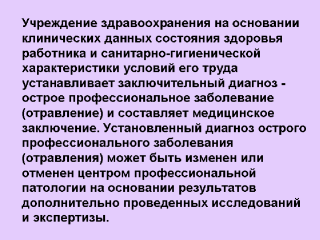 Ответственность за своевременное извещение о случае острого профессионального заболевания, об установлении, изменении или отмене диагноза возлагается на руководителя учреждения здравоохранения, в которое обратились или к которому прикреплены пострадавшие.