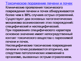 Специфические и неспецифические поражения этих органов взаимоотягощают друг друга. Повреждение печени и почек при остром отравлении обусловлено общими филогенетическими и анатомическими особенностями этих органов, их тесной функциональной связью. Это позволило выделить особый гепаторенальный синдром токсической этиологии. |