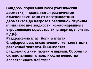 Болевой синдром. Эмоциональная реакция организма на повреждающее воздействие на кожу и слизистые оболочки дыхательного и желудочно-кишечного тракта, а также вызванная химическими ожогами (едкие кислоты и щелочи, раздражающие газы и пары). При отравлениях сулемой развивается кишечная колика. При отравлении таллием - тяжелая невралгия.