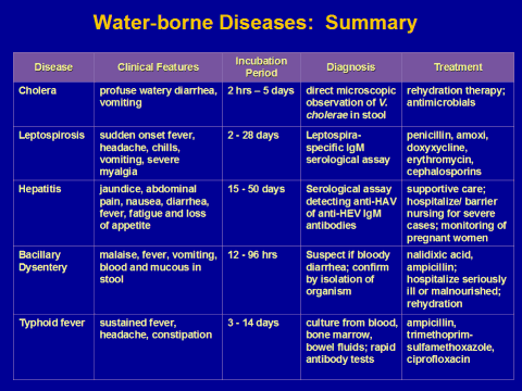 Prevention/Control Measures: hand washing, proper handling of water/food and sewage disposal; vaccination for Hep A and Typhoid