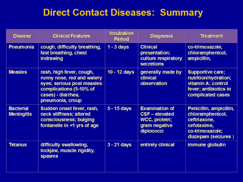 Prevention/Control Measures: Pneumonia: isolation; proper nutrition; if cause is Streptococcus, polyvalent vaccine to high risk populations Measles: rapid mass vaccination within 72 hours of initial case report (priority to high risk groups if limited supply); Vitamin A in children 6 months to 5 years of age to prevent complications and reduce mortality Meningitis: rapid mass vaccination Tetanus: thorough wound cleaning, tetanus vaccine |