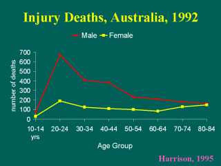| In this slide, we see the number of injury deaths in Australia by age and gender. The graph suggests that injury deaths are particularly significant in young adults and men. |