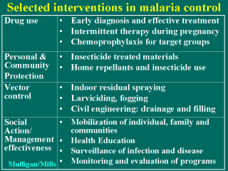 - Personal and community protection such as insecticide treated bed nets