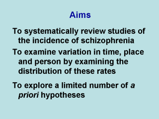 | As part of a wider systematic review of the incidence and prevalence of schizophrenia, we present data and analyses related to the incidence of this disorder. We also briefly present the methods of the analyses and the key characteristics of the included studies (divided into core studies, cohort and Other Special Groups). We will describe the distribution of rates and then sort these rates to examine several main hypotheses. |
