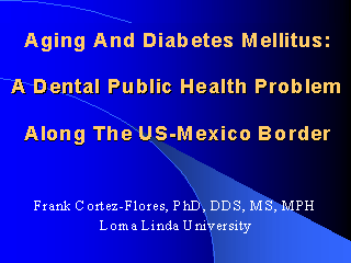 Although space constraints does not allow addressing every infection that is seen in patients with diabetes, this lecture will stress the assertion that oral infections (e.g., periodontal diseases) may cause substantial morbidity in such patients. It is extremely important to know what is the impact of diabetes on oral health and which are the risk factors that contribute to the development/morbidity of Type 2 DM. This information allows the health professionals to measure the burden of the disease and develop and implement ways of controlling and/or minimize the risk factors. Thus, dental public health practitioners as well as primary health care providers should be aware of the impact of diabetes on oral health. The prevalence of Type 2 DM, which increases with age, is particularly high among women over age 40. The American Diabetes Association (ADA) has identified a number of screening factors to recognize individuals with high risk of developing Type 2 diabetes. Some of these risk factors as identified by the ADA are family history of Type 2 diabetes, Body Mass Index (BMI) greater than 30, ethnicity, age (40 years old and older), and, in women, a history of gestational diabetes and/or having a baby weighing nine or more pounds at birth. Furthermore, a survey of the literature has revealed that a number of diabetes studies have been conducted in the American southwestern states, particularly in Texas, New Mexico, and Colorado, that demonstrated a high prevalence of diabetes in the Hispanic population. Of interest to this presentation, and as maintained by the Bureau of the Census (1990), the majority of Hispanic Americans live in the south-central and southwestern United States. LEARNING OBJECTIVES