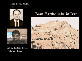 | In Dec. 2003 Iran was rocked by a huge early quake. We got one of the word’s leaders, Eric Noji to produce a lecture on the Bam Earthquake. In addition, a person who was on the ground Ali Aldadan, a Ph.D. student in epidemiology produced a second JIT lecture on the unfolding events. Ali taught the students in Pittsburgh with PowerPoint presented here, and him teaching over the telephone. The results of this was published in the Lancet. |