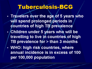 | Screening for tuberculosis may have a role in travel medicine, especially to document exposure in longer term travelers or workers, however BCG vaccination is mainly restricted to young children in endemic areas or traveling to endemic areas. |
