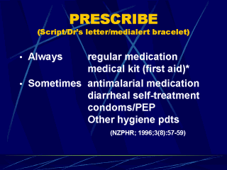 | It is important to plan for a stock of regular medication that is normally taken by the traveler, as well as examining the need for a travelers’ medical kit and prophylaxis drugs, such as for malaria. It is also important that those who advise on travel health obtain a copy of their national guidelines for malaria chemoprophylaxis, as well as any other relevant travel health guidelines. |