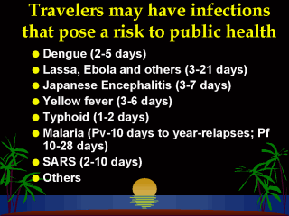 of a disease of public health importance. Several examples of infections that pose a potential risk to public health are given here. The incubation periods can be quite short and travelers may become ill on return home.
