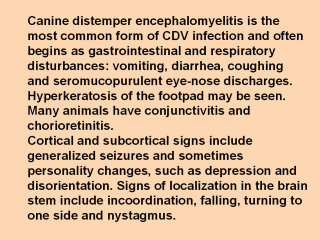 and periorbital muscles are affected. Acute optic neuritis, typically accompanied by dilated unrespons-ive pupils, may be the only sign of CD. CDV is a common cause of convulsions. Cell-mediated immunosuppression can also occur, predisposing hosts to other infectious agents. |