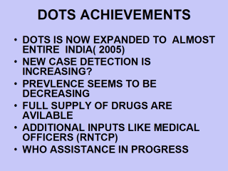 RNTCP: DECENTRALIZATION OF PROGRAMME MANAGEMENT, WITH THE STATES SHOULDERING INCREASING RESPONSIBILITY OF RUNNING THE PROGRAMME. AS A STEP TOWARDS DECENTRALIZATION OF PROGRAMME MANAGEMENT OTHER SECTORS INCLUDING CIVIL SOCIETY INVOLVED PARTNERSHIPS BUILT WITH OTHER SECTORS, NAMELY: NGOS AND PRIVATE PRACTITIONERS (PP): EMPLOYEES STATE INSURANCE SCHEME (ESIS) AND RAILWAYS; MEDICAL COLLEGES AND TB HOSPITALS; AND OTHER HEALTHCARE PROVIDERS. NODAL CENTRES HAVE BEEN ESTABLISHED IN 5 ZONES OF THE COUNTRY TO INCREASE THE INVOLVEMENT OF MEDICAL COLLEGES IN RNTCP. A STRONG IEC CAMPAIGN DEVELOPED |