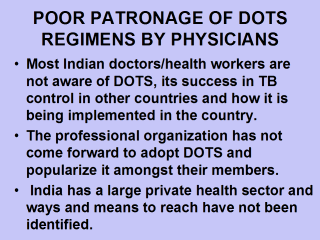 AND IN PLENTY Unfortunately, not all sputum positives are not getting them. Those who are getting are not able to take them full course Only few patients are getting correct regimens No patronage of dots by medical professionals |