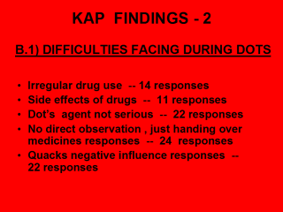 IMPROVING DOT'S TREATMENT Confidence building - 13 responses Good diet - 21 responses Removal of fear of side effects - 15 responses Group meetings to increase compliance - 7 responses Bringing to doctor - 11 responses Approaching through village leaders and teachers - 30 responses Frequent house visits - 28 responses |