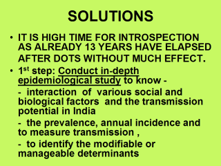2nd step: Revise policy & targets keeping the Indian patient in view. His poverty, illiteracy and his beliefs should be given first importance while formulating a relevant policy and targets. 3rd step: Make direct observation foolproof. Use preferably family member as dots observer by some mechanism (incentive) as no one else is more dependable to observe the treatment. Health workers are overloaded. Village teachers etc are less reliable even though they were paid. People usually don't go near a patient unless strongly motivated. This we can do only with kith and kin. 4th step: Community sensitization: Even Prime minister of India can not be successful, if the people are not actively involved in Tb control. Make the health professionals know and practice Dots regimens, if necessary by legislation to prevent MDRTB. 5th step: Strong Information education and communication activities are imperative to increase awareness and relieve the doubts and superstitions. Mass media should take up the cause on war footing basis. Only on World Tb Day, two days ago, I have seen anti tb slogan in television for the first time. Establish village tb clubs including patients. 6th step: Utilize all human resource available particularly the youth . Give the college youth the printed pamphlets and ask them to visit villages for motivation during vacation periods. |