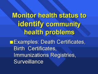 | Examples of monitoring health status to identify community health problems include the many surveillance systems in place through the nation. When used correctly death certificates, birth certificates and immunization registries all tell us about the health of our communities and allow us to take action based upon solid information. |