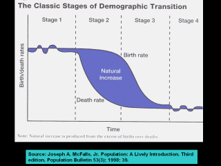 During stage 1, both the death rate and the birth rate are high. But the birth rate is constant, while the death rate fluctuates in the face of such manmade and natural disasters as famines, floods, pestilence, and wars. During stage 2, the death rate begins a sharp decline due to major improvements in living standards attributable to industrialization. Any decline in the birth rate occurs close to the end of this stage. The large gap between the birth rate and the death rate accounts for the population explosion. During stage 3, the birth rate falls closer to the death rate as people start controlling their fertility and limiting family size in recognition that most of their children will actually survive into adulthood, and as children become more expensive to raise largely because of increasing educational demands stemming from the industrialization process. A declining need for farm labor and parental support in old age has also depressed fertility. In stage 4, the final stage, birth rates and death rates are both low. But in contrast to stage 1, birth rates fluctuate, indicative of fertility control as people alter their reproduction according to socioeconomic changes. England was the first country to pass through the demographic transition. This took approximately 200 years. Some other countries, such as Japan, which started the process rather later than England, completed their passage through the transition in less than half that time. |