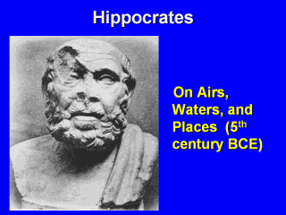 published in the fifth century before the common era. Here are some excerpts: “Whoever wishes to investigate medicine properly, should proceed thus: in the first place to consider the seasons of the year, and what effects each of them produces.” “…We must also consider the qualities of the waters.” “…and the mode in which the inhabitants live, and what are their pursuits, whether they are fond of drinking and eating to excess, and given to indolence, or are fond of exercise and labor, and not given to excess in eating and drinking.” |