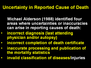 | Note four areas where uncertainty or inaccuracy can occur in reporting causes of death. They pertain to diagnosis, completion of the death certificate, processing and publication of the mortality data, and classification of attributable diseases and injuries. |