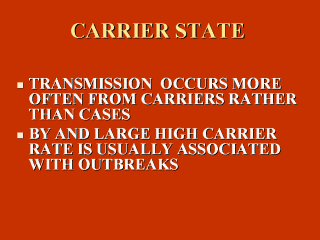 HOWEVER, BEHAVIOR OF CARRIER STATE IS ANAMOLOUS AND NO PREDICTION CAN BE MADE BASING ON THE CARRIER STATE. OUTBREAKS CAN OCCUR EVEN WITH LOW CARRIER RATE < 25%. |