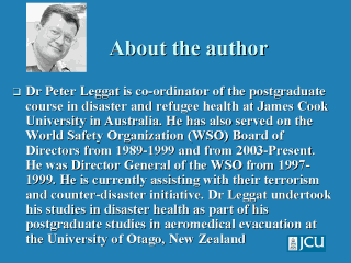 Dr Peter Leggat is Associate Professor, Deputy Director and Academic Adviser, Anton Breinl Centre for Public Health and Tropical Medicine, James Cook University, Townsville, Australia, and Visiting Professor in the School of Public Health, University of the Witwatersrand, Johannesburg, South Africa. His qualifications include: MD (higher doctorate in medicine), University of Queensland, Australia PhD (in occupational health), University of South Australia DrPH (in travel medicine), James Cook University, Australia Dr Leggat is a specialist in public health medicine and holds Fellowship of several professional organisations. He is a former Fulbright Scholar and also the recipient of the Surgeon General’s Medal (Australia) in 2002. He has been a Board Member for the International Society of Travel Medicine (2003-2005), the World Safety Organization (1989-1999, 2003-2005; incl. Director-General 1997-1999), and the Australasian College of Tropical Medicine (1991-Present; incl. President 1996-1998, 2002-2004). |
