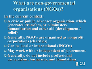 There are many definitions of non-governmental organizations (NGOs). This definition is given in the context of disaster health management. It is important to realize that organizations may relate to definitions other than that prescribed for NGOs, e.g. International Committee of the Red Cross (see www.icrc.org) |