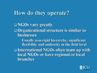 NGO structure is often similar to that of a business and usually retain considerable flexibility in responding to disasters. NGOs may have international structures as well as local or regional structures, which can assist in their timely response. |