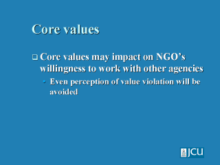 Such core values may contrast or conflict with core values of other groups involved with disaster health response.