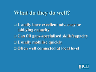 Advocacy is important for fundraising and working with various groups and organizations involved in disaster health response. Those NGOs with local branches are usually well connected at the local level, which can assist greatly with timely response. |