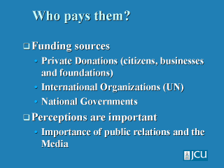 NGOs need funding. Some funding may be provided by government, but often funding comes from the private sector, particularly through specialized foundations and fund-raising arms of the NGO. |