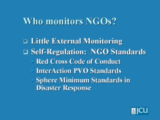 As there is little formal external monitoring of NGOs, several NGOs and related organizations, involved in disaster health response, have developed their own standards and codes of practice. |